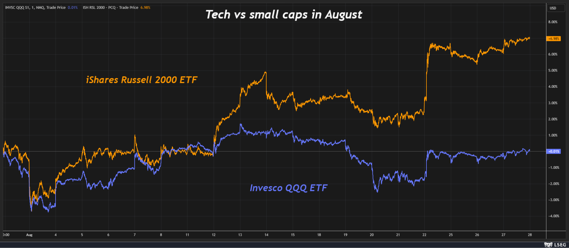 行情走势间的对比,其实能够清晰地反映出这一点:在8月仅剩下最后一个交易日的背景下,纳斯达克100指数本月迄今的涨幅仅为2.1%,而罗素2000指数则大幅攀升了7.5%。